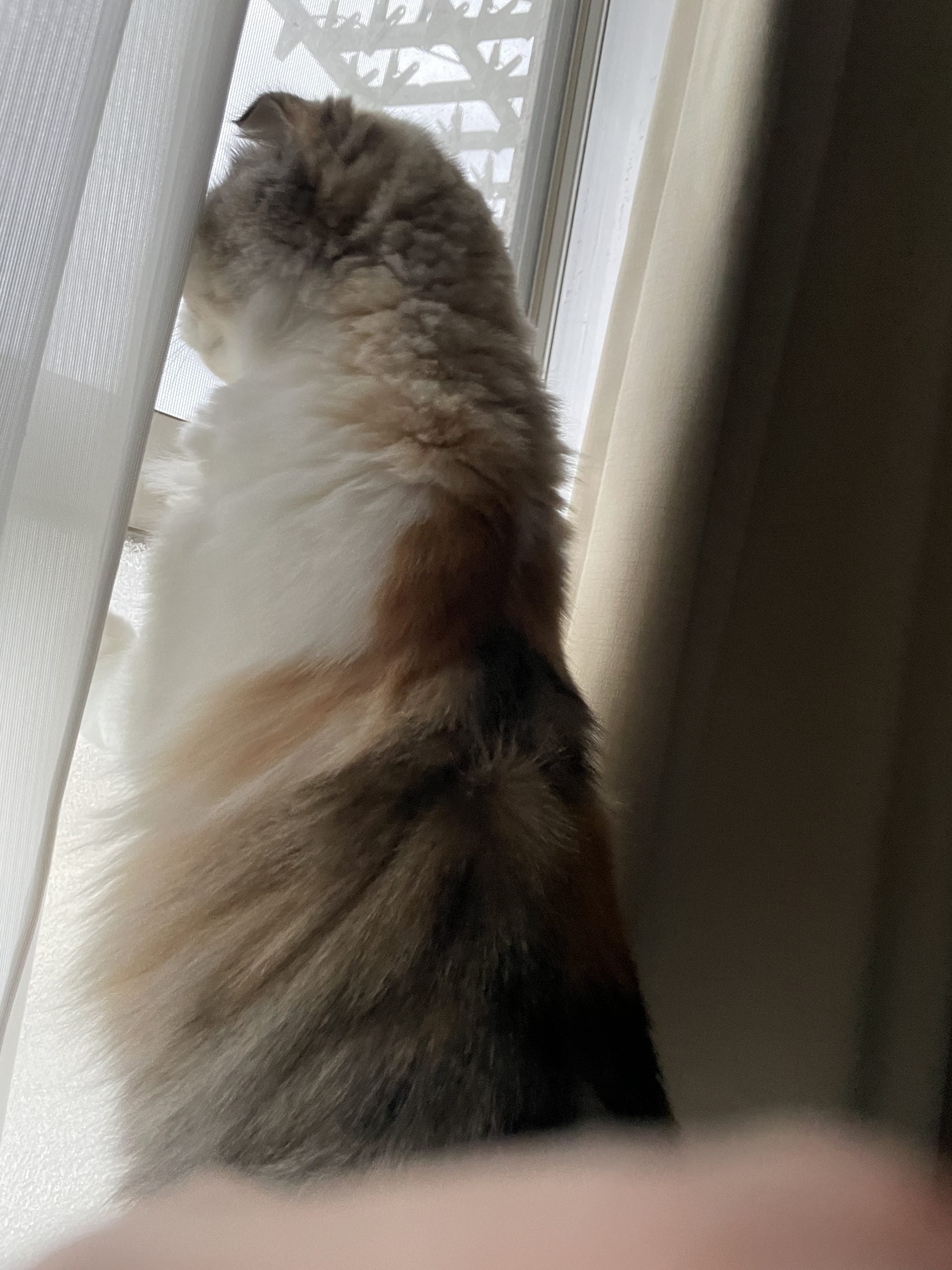 外を眺めてシッポをフリフリ。首周りの毛は私が切ってあげています。