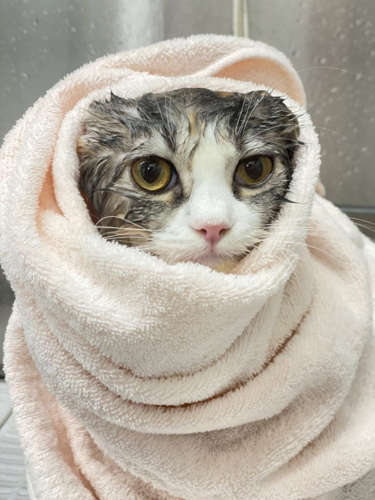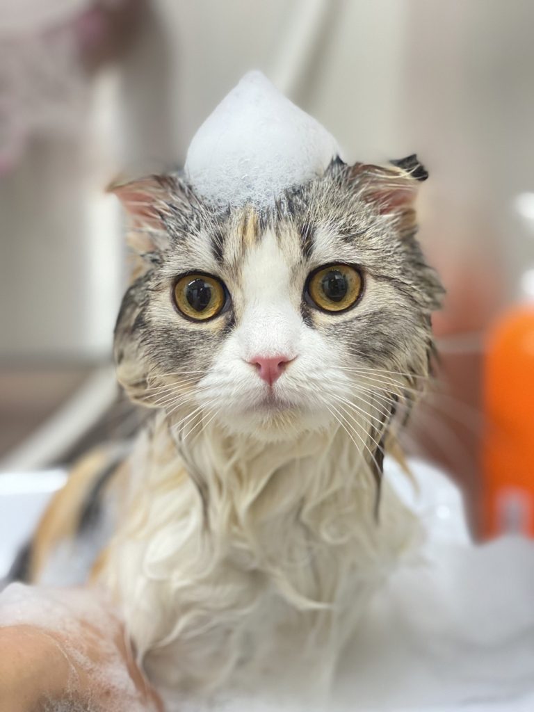今日のできごと はじめてのシャンプー 今日のできごと 2024.03.052024.04.01 意外と嫌がらなかったらしいです。トリマーさんが写真を撮ってくれました。家でも1度お尻を洗うため洗面台にお湯を張って入れましたが気持ち良さそうでした。でもシャワーの音とドライヤーの音は怖かったみたいで逃げていきました。それ以来、我が家では空に音に慣れてもらうためにリビングでドライヤーを使っています。